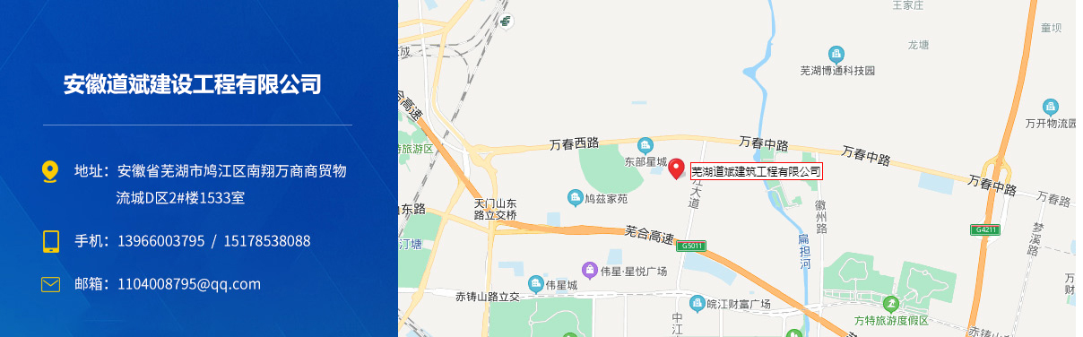 - 安徽道斌建設(shè)工程有限公司成立于2018年4月,主要從事工程施工、工程勞務(wù)、鋼結(jié)構(gòu)施工、市政公用施工,市政施工總承包貳級(jí)、地基基礎(chǔ)工程專業(yè)承包貳級(jí)、防水防腐保溫工程專業(yè)承包壹級(jí)、鋼結(jié)構(gòu)工程專業(yè)承包貳級(jí)、建筑裝修裝飾工程專業(yè)承包貳級(jí)、建筑工程施...
